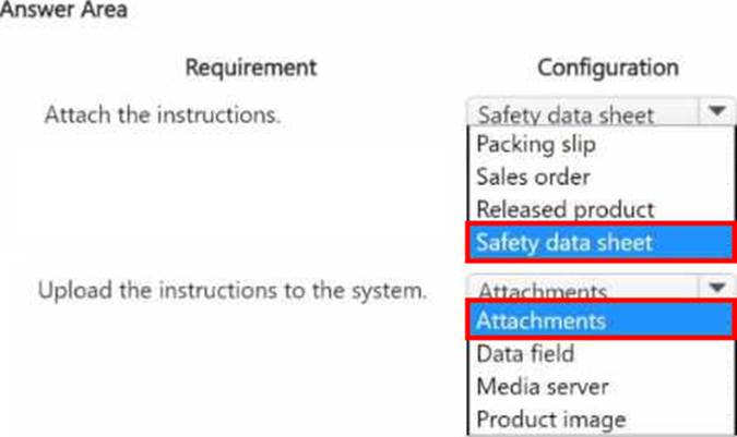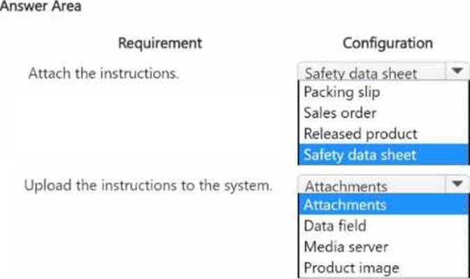The company requires that when a sales order’s packing slip is printed for a product that contains a toxic chemical, the instructions must also be printed for inclusion in the shipment. You need to configure the system to meet the requirements.