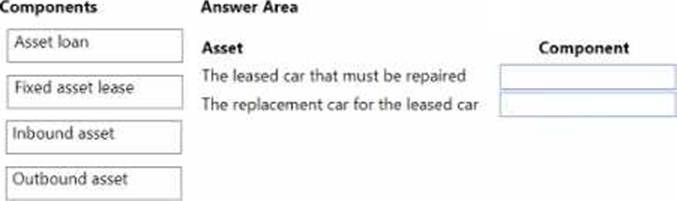 The leased car that must be repaired: You should use the Inbound asset component. An inbound asset is an asset that is received from a customer or vendor for maintenance or repair1. You can use the Inbound assets page to create and manage inbound assets in Asset Management2. You can also create a maintenance request for an inbound asset and link it to a work order3.