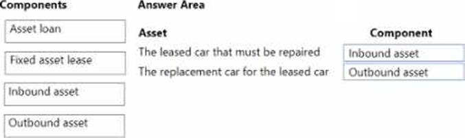 The leased car that must be repaired: You should use the Inbound asset component. An inbound asset is an asset that is received from a customer or vendor for maintenance or repair1. You can use the Inbound assets page to create and manage inbound assets in Asset Management2. You can also create a maintenance request for an inbound asset and link it to a work order3.