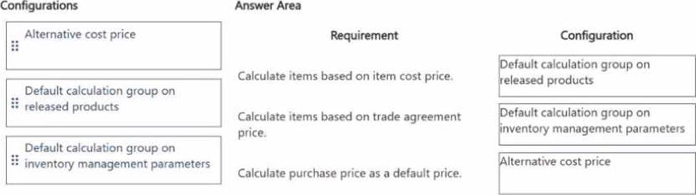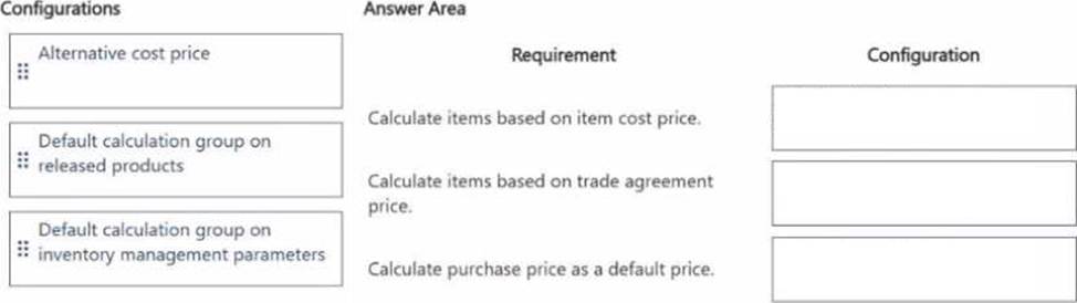 Which configurations should you use? To answer, drag the appropriate configurations to the correct requirements. Each configuration may be used once, more than once, or not at all. You may need to drag the split bar between panes or scroll to view content. NOTE: Each correct selection is worth one point.