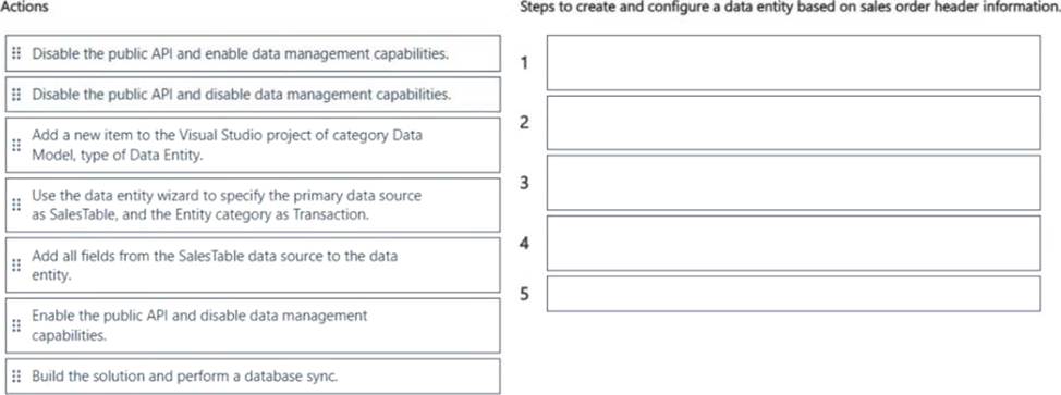 Which five actions should you perform in sequence? To answer, move the appropnate actions from the list of actions to the answer area and arrange them in the correct order.