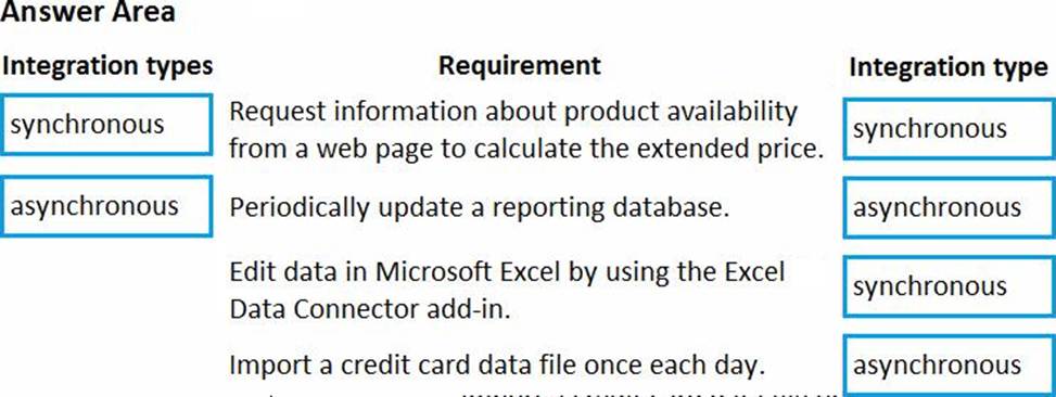 Which integration types should you use? To answer, drag the appropriate integration types to the correct requirement. Each integration type may be used once, more than once, or not at all. You may need to drag the split bar between panes or scroll to view content. NOTE: Each correct selection is worth one point.