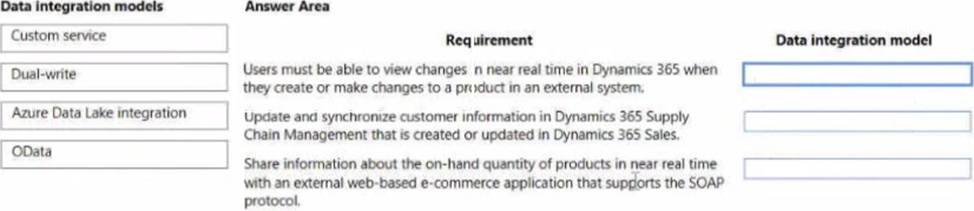 Which integration model should you select? To answer, drag the appropriate data integration models to the correct requirements. Each data integration model may be used once, more than once, or not at all. You may need to drag the split bar between panes or scroll to view content. NOTE: Each correct selection is worth one point.
