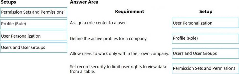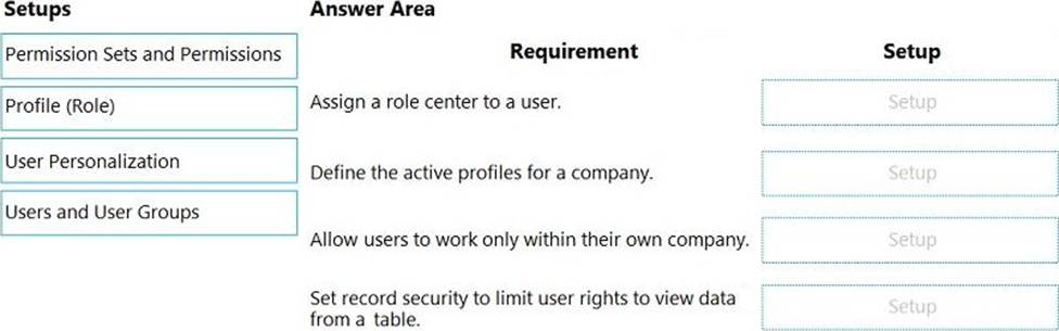 Which setup should you use? To answer, drag the appropriate setups to the correct requirements. Each setup may be used once, more than once, or not at all. You may need to drag the split bar between panes or scroll to view content. NOTE: Each correct selection is worth one point.