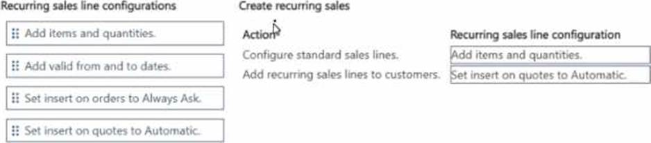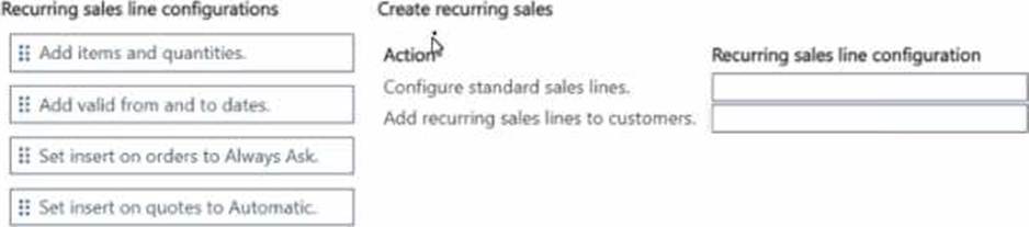 How should you complete each action? To answer, move the appropriate recurring sales line configurations to the correct actions. You may use each recurring sales line configuration once, more than once, or not at all. You may need to move the split bar between panes or scroll to view content. NOTE: Each correct selection is worth one point.