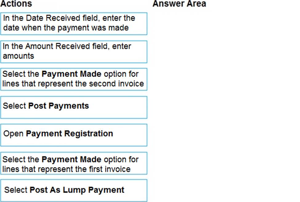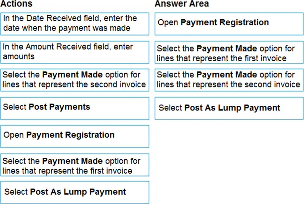 You need to process a single full payment from a customer against the amounts due for two invoices by using customer payment registration.