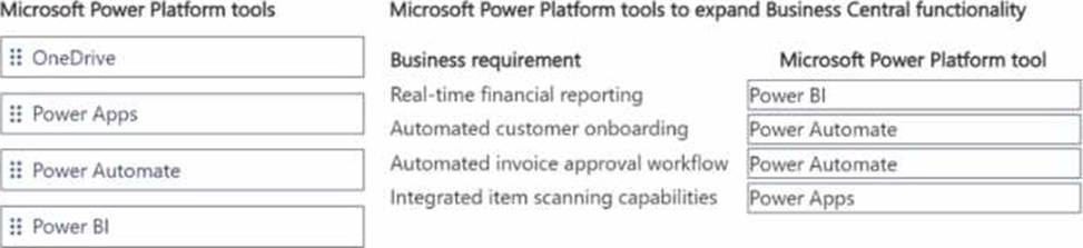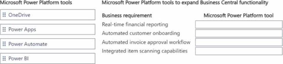 Which Microsoft Power Platform tools should you recommend? To answer, move the appropriate business Microsoft Power Platform tools to the correct requirements. You may use each Microsoft Power Platform tool once, more than once, or not at all. You may need to move the split bar between panes or scroll to view content. NOTE: Each correct selection is worth one point.