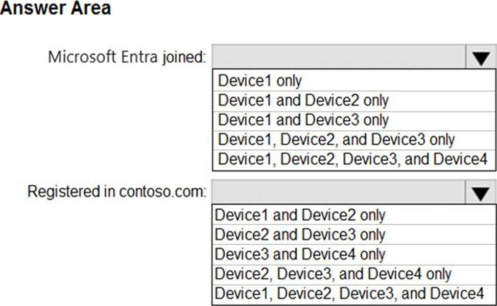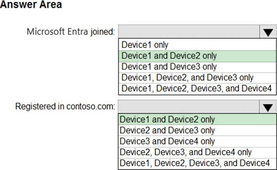 Which devices can be Azure AD joined, and which devices can be registered in contoso.com? To answer, select the appropriate options in the answer area. NOTE: Each correct selection is worth one point.