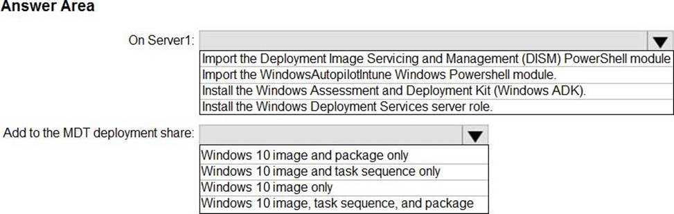What should you do on Server1, and what are the minimum components you should add to the MDT deployment share? To answer, select the appropriate options in the answer area. NOTE: Each correct selection is worth one point.