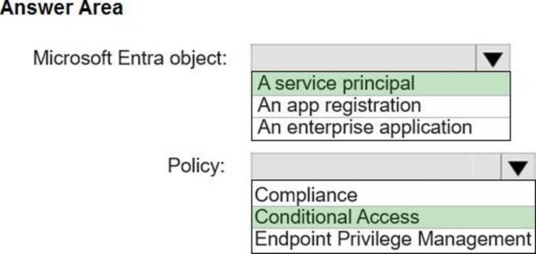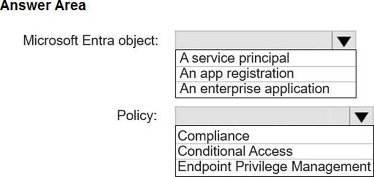 Which type of Microsoft Entra object should you create, and which type of policy should you configure? To answer, select the appropriate options in the answer area. NOTE: Each correct selection is worth one point.