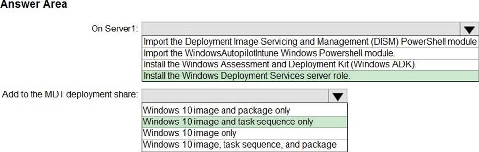 What should you do on Server1, and what are the minimum components you should add to the MDT deployment share? To answer, select the appropriate options in the answer area. NOTE: Each correct selection is worth one point.