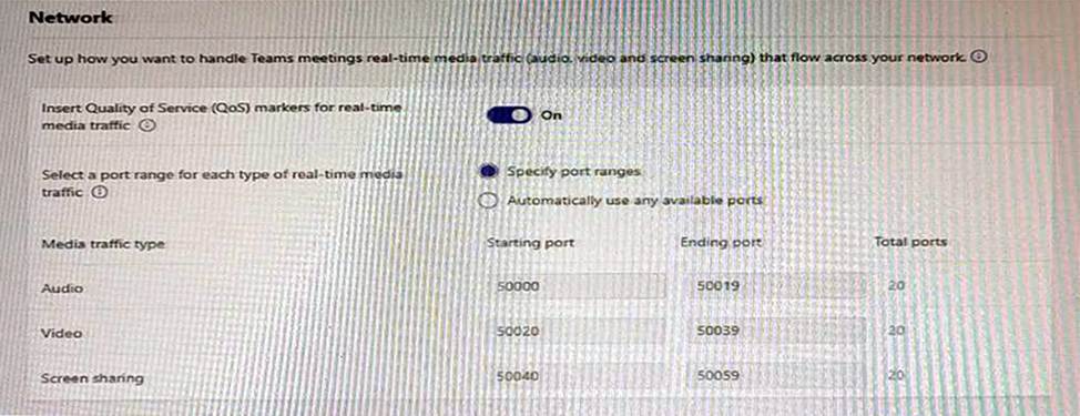 The network meeting settings for Microsoft Teams are configured as shown in the following exhibit.