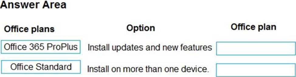 Which Office plans should you use? To answer, drag the appropriate Office plans to the correct options. Each Office plan may be used once, more than once, or not at all. You may need to drag the split bar between panes or scroll to view content. NOTE: Each correct selection is worth one point.