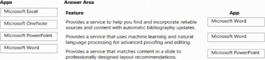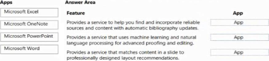 Which Microsoft 365 Apps apps should you use? To answer, drag. the appropriate apps to the correct features. Each app may be used once, more than once, or not at all. You may need to drag the split bar between panes or scroll to view content. NOTE: Each correct selection is worth one point.