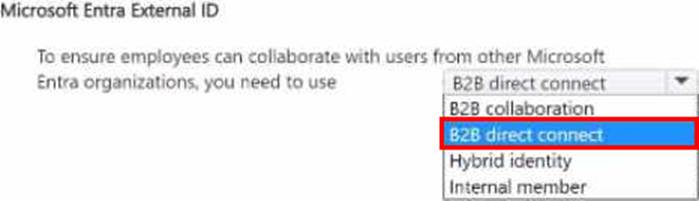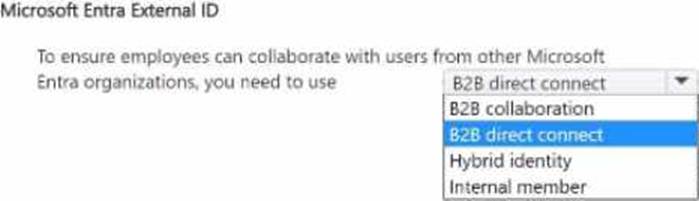 The company plans to allow employees to collaborate with other Microsoft Entra organizations by using Teams shared channels. Employees must be able to add users from the other organizations to the shared channel without having to switch organizations or to sign in with a different account. You need to ensure employees can collaborate with users from other Microsoft Entra organ nations. Select the answer that correctly completes the sentence.