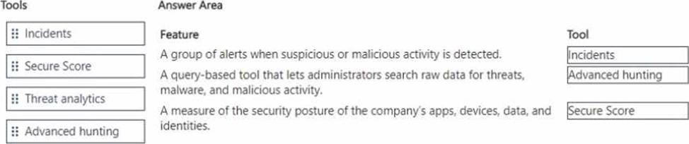 Which tool should you identify? To answer, drag the appropriate tools to the correct features. Each tool may be used once, more than once, or not at all. You may need to drag the split bar between panes or scroll to view content. NOTE: Each correct selection is worth one point.