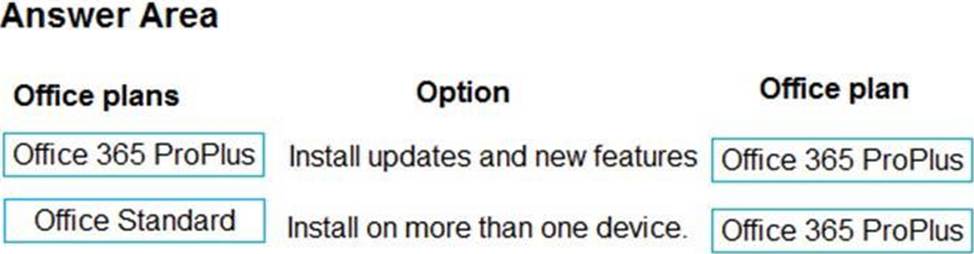 Which Office plans should you use? To answer, drag the appropriate Office plans to the correct options. Each Office plan may be used once, more than once, or not at all. You may need to drag the split bar between panes or scroll to view content. NOTE: Each correct selection is worth one point.