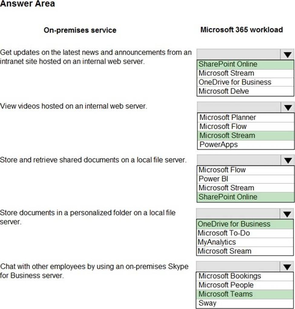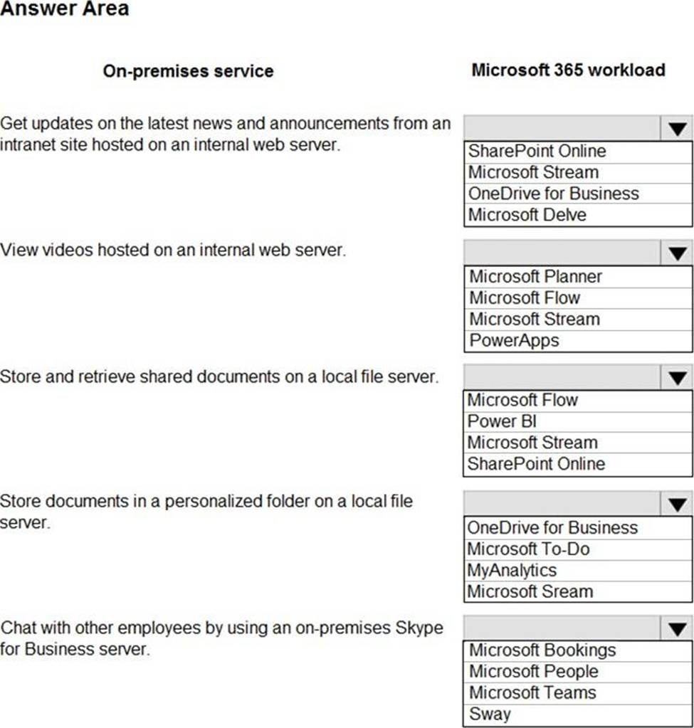 You need to determine which Microsoft 365 workload is appropriate to replace each on-premises service.
