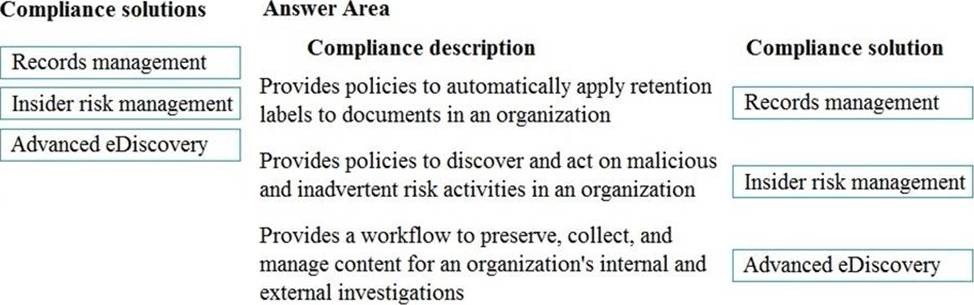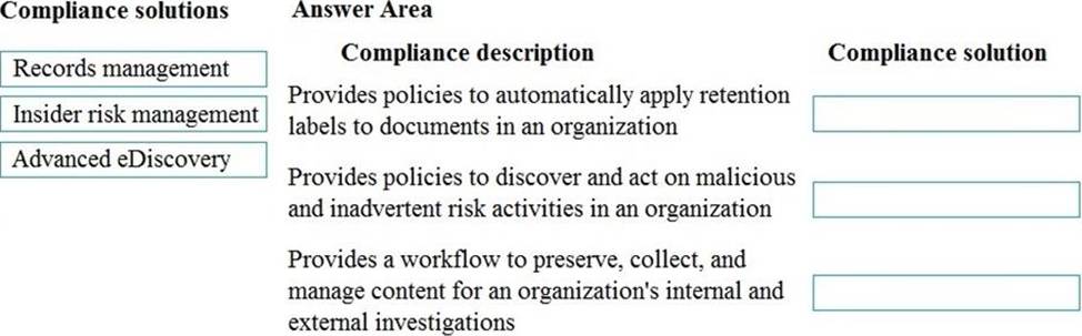 Match each compliance solution to its description. To answer, drag the appropriate compliance solution from the column on the left to its description on the right. Each compliance solution may be used once, more than once, or not at all. NOTE: Each correct match is worth one point.