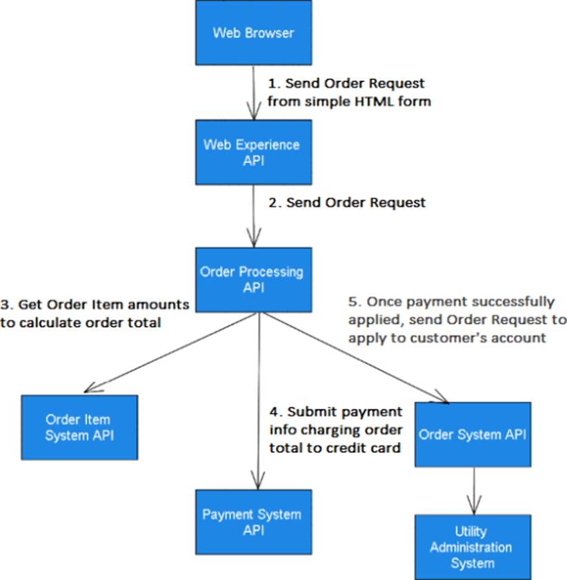 A shopping cart checkout process consists of a web store back end that sends a sequence of HTTPS POST requests to an Experience API, which in turn invokes a Process API using HTTPS. The web store back end executes in a Java EE application server. All API implementations are Mule applications executing in a customer-hosted Mule runtime.