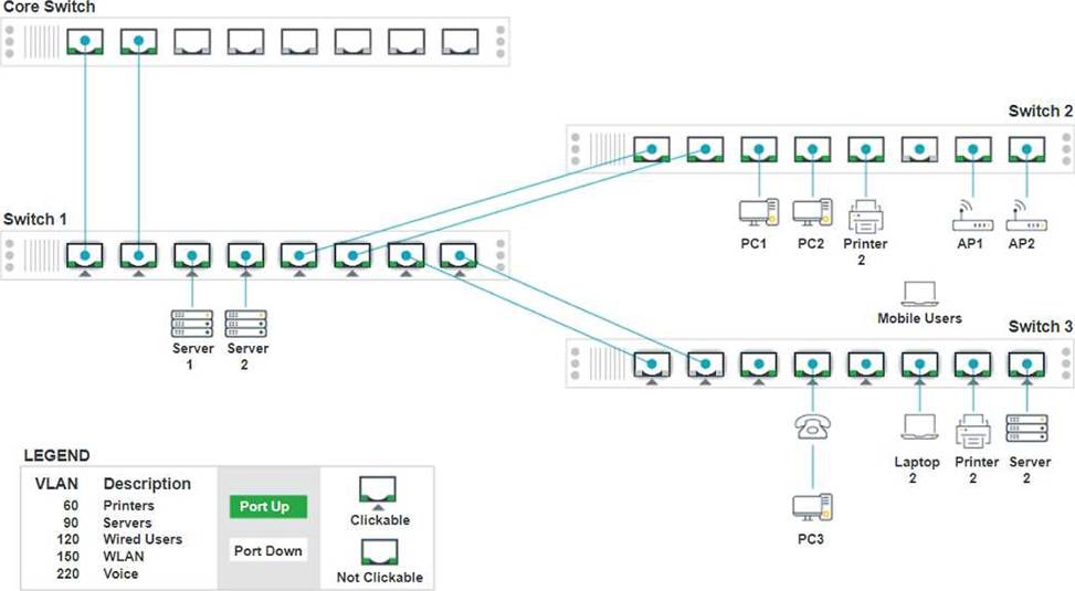 Ports 3, 4, 5, 6, and 7 on Switch 3 are enabled for default VLAN1. Ensure All Switches and Ports are Configured as per the Requirements: Core Switch Ports should be configured as needed for uplinks to Switch 1. Ensure LACP is enabled for redundancy on trunk ports between switches.