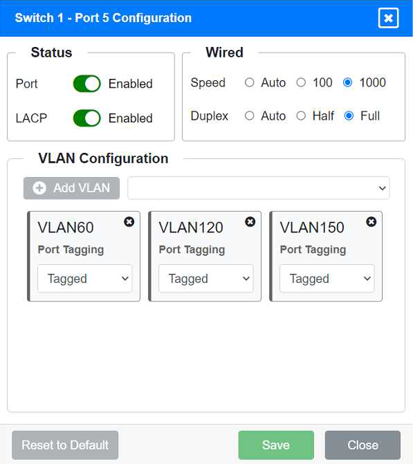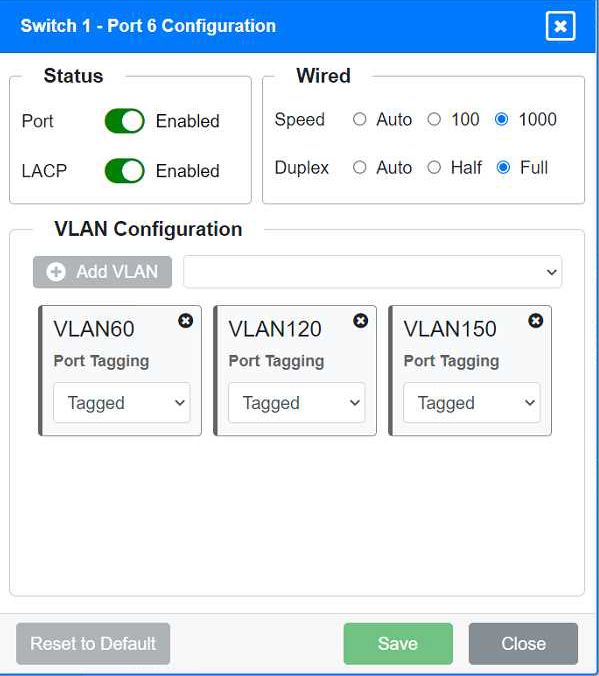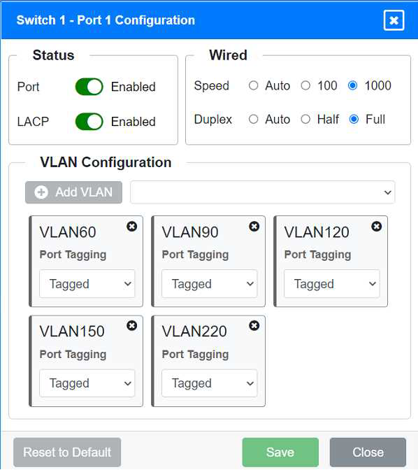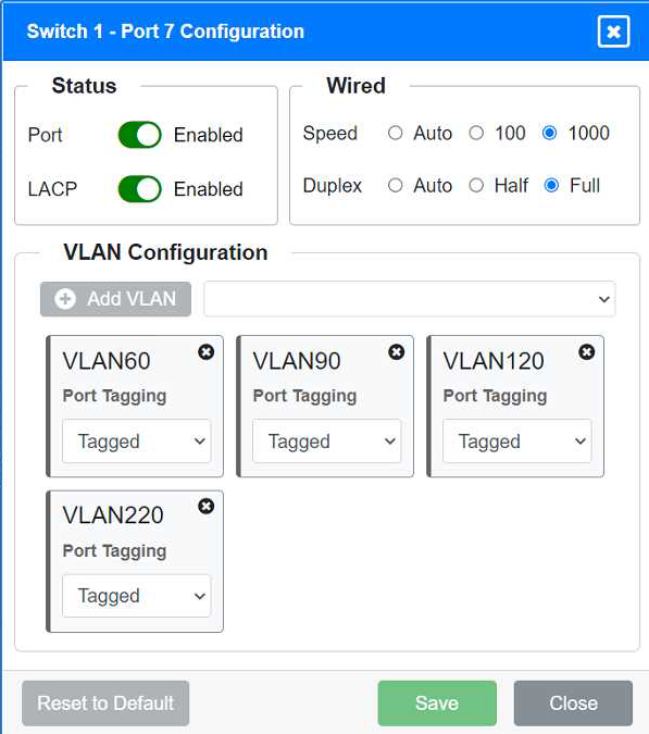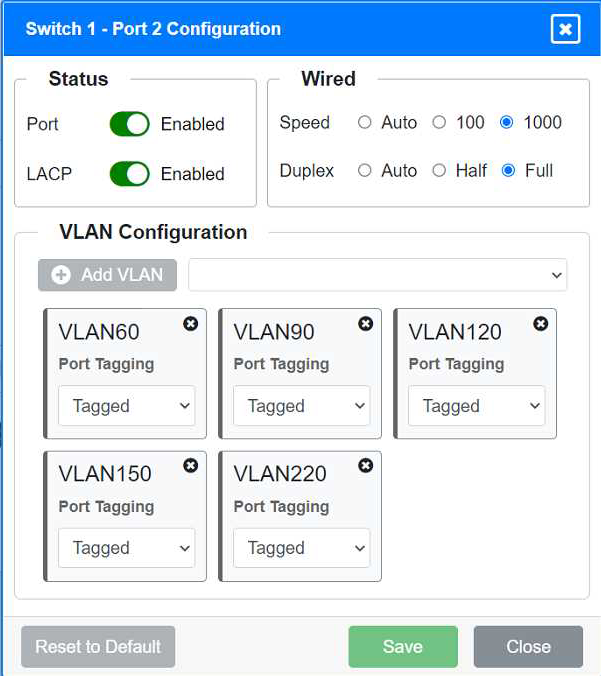 VLAN Configuration: Tagged for VLAN60, VLAN90, VLAN120, VLAN150, VLAN220 Port 2 Configuration (Uplink to Core Switch) Status: Enabled