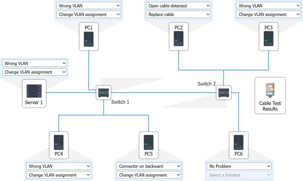Review the cable test results first, then diagnose by clicking on the appropriate PC, server, and Layer 2 switch.