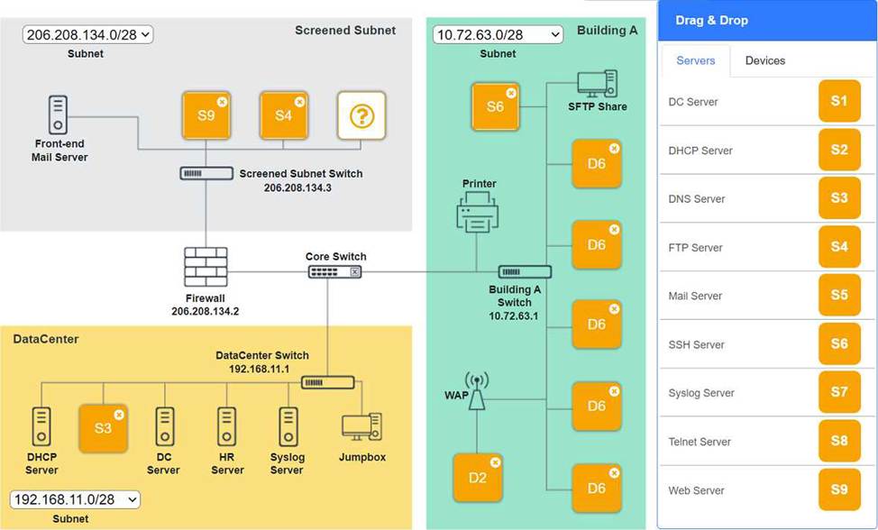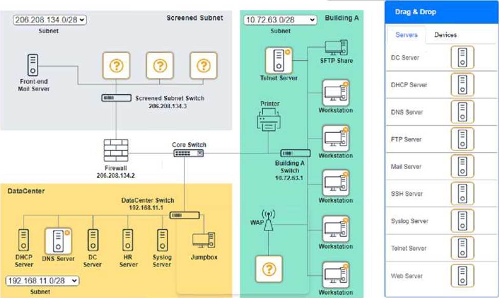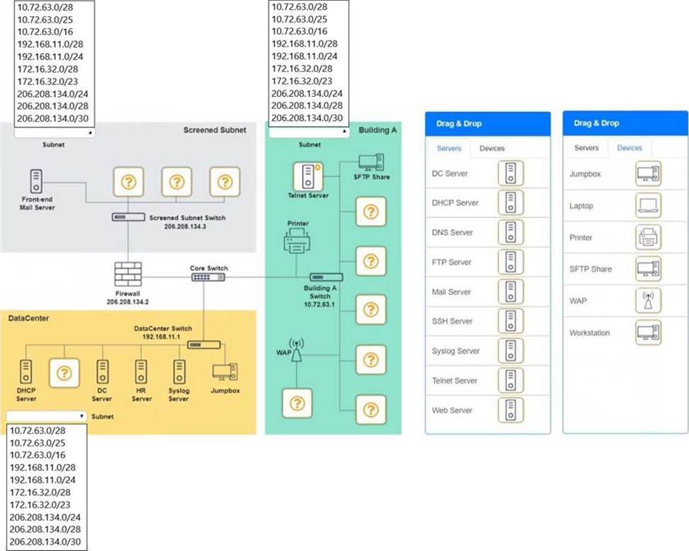Building A devices C SSH server top left, workstations on all 5 on the right, laptop on bottom left DataCenter devices C DNS server.