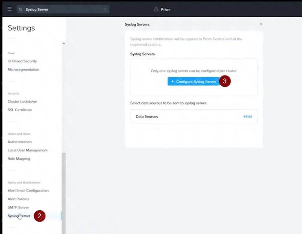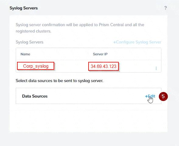 Log in to Prism Central and go to Network > Syslog Servers > Configure Syslog Server. Enter Corp_syslog as