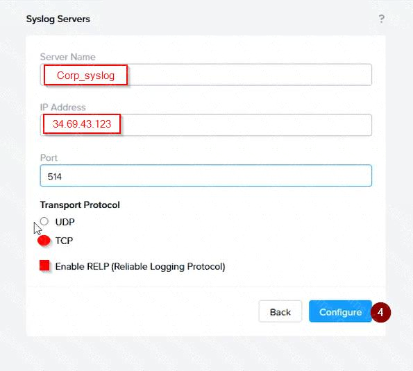 Syslog Name: Enter "Corp_syslog" as the name for the syslog configuration.
