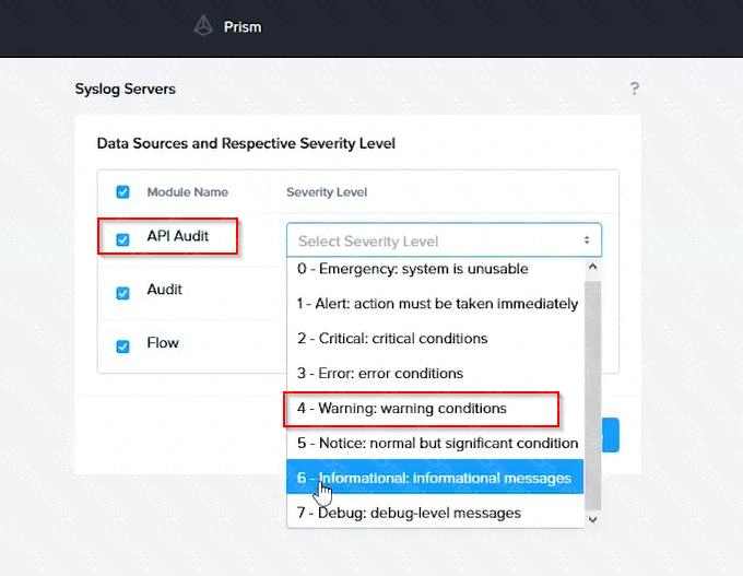 Look for the settings related to audit logs and API requests. Enable the audit logging feature and select the top 4 severity levels to be logged.
