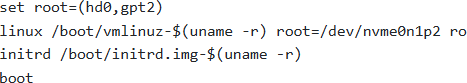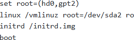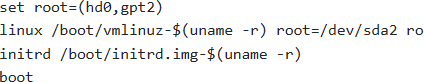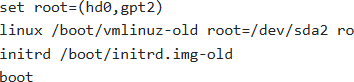 Option C attempts this by specifying ‘-old’ in the kernel and initrd filenames, attempting to load the older, hopefully functional, kernel. It assumes the root partition is /dev/sda2 but is booting an older kernel.