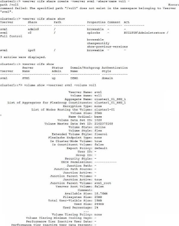 When an administrator tries to create a share for an existing volume named voll, the process fails with an error.