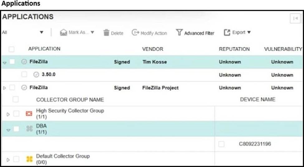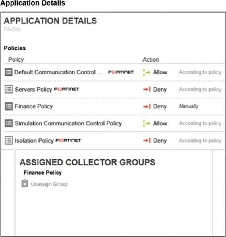 The collector C8092231196 belongs to the Finance group, but the Finance policy is not applied to the collector group where the device is currently located. To enforce the deny rule defined in the Finance policy for FileZilla, the policy must be assigned to the collector group that contains the device. Assigning the Finance policy to the DBA group ensures the policy applies to the collector and blocks the application.