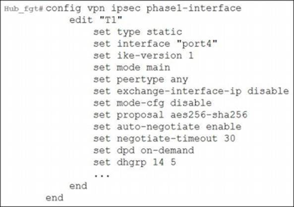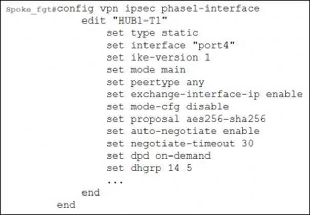 Refer to the exhibits, which show the VPN configuration on a spoke and a hub.