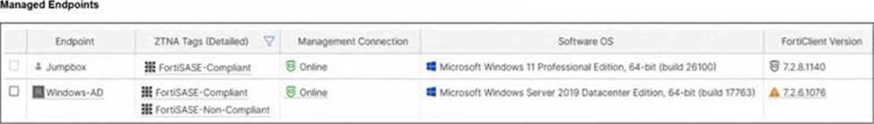 Endpoint Analysis: The Managed Endpoints exhibit shows that while Jumpbox only has the FortiSASE-Compliant tag, the Windows-AD endpoint has been assigned both FortiSASE-Compliant and FortiSASE-Non-Compliant tags. This indicates that a security posture check on the Windows-AD device has failed, triggering a rule that applies the non-compliant tag.