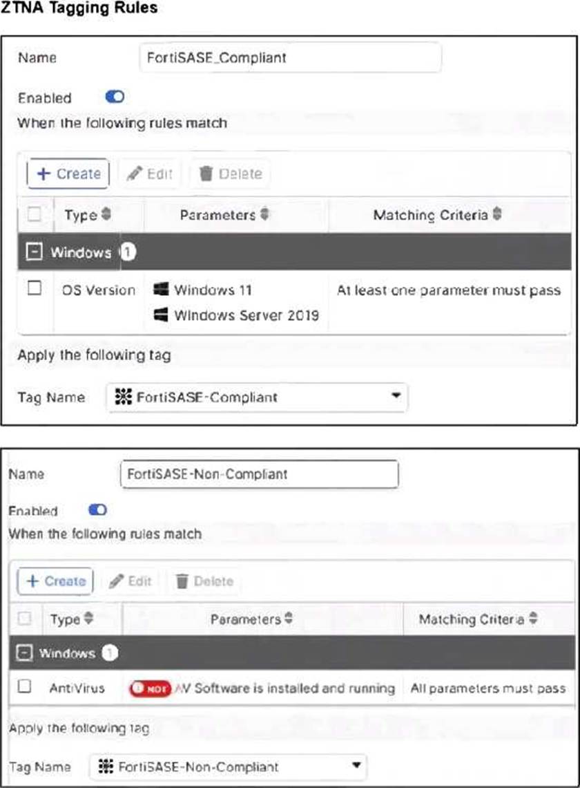 In FortiSASE, Zero Trust Network Access (ZTNA) tags―also known as security posture tags―are used to dynamically grant or deny access based on the real-time security state of an endpoint. This mechanism ensures that only devices meeting specific compliance requirements can access protected resources or the internet.