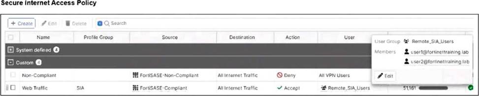 Policy Evaluation: The Secure Internet Access Policy table shows two custom policies. The first policy, named Non-compliant, uses the FortiSASE-Non-Compliant tag as its source and has the action set to Deny. The second policy, Web Traffic, allows access for FortiSASE-Compliant users.