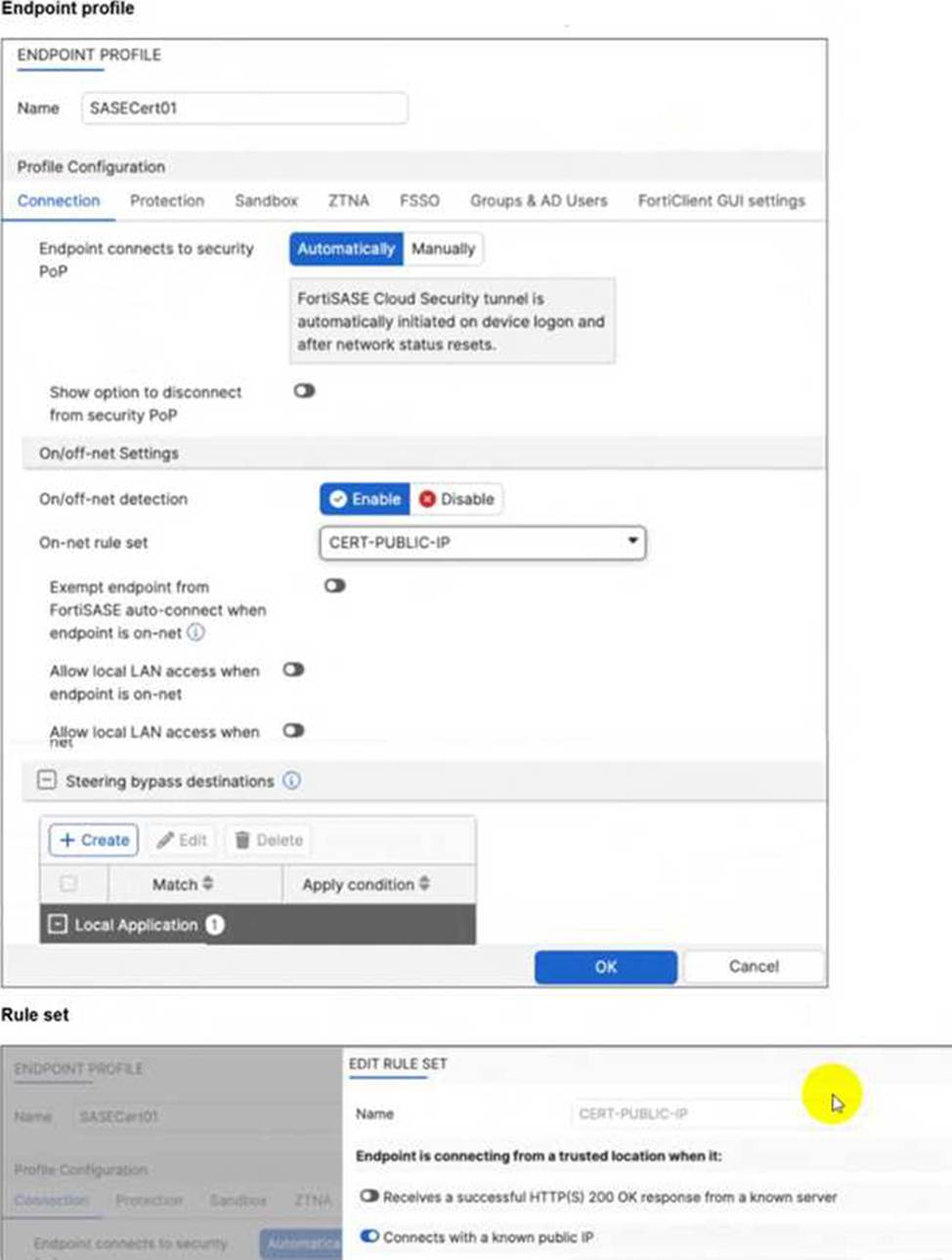 Rule Set Definition: The first part involves defining what constitutes an "on-net" or "on-fabric" status. In this scenario, the customer successfully configured a rule set named CERT-PUBLIC-IP using the Connects with a known public IP detection type. This tells FortiSASE that if the endpoint’s public WAN IP matches the corporate gateway, it is considered to be on the corporate network.