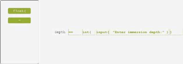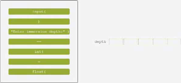 Insert the code boxes in the correct positions in order to build a line of code which asks the user for an integer value and assigns it to the depth variable. (Note: some code boxes will not be used.)