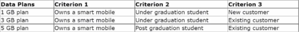 MyCo, a telecom company, developed a new data plan group to suit the needs of its customers. The following table lists the three data plan actions and the criteria that customers must satisfy to qualify for the offer: