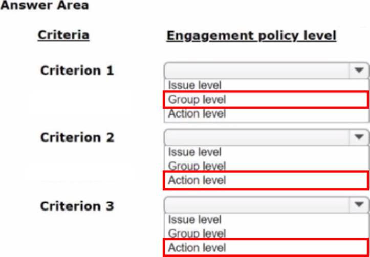 As a decisioning architect, you are setting up the action hierarchy for MyCo. Select the correct action hierarchy level for each of the hierarchy items identified.