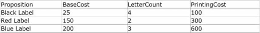 As a decisioning architect, you have built a decision strategy that selects actions that are below the average printing cost. The decision strategy contains ‘Black Label’, ‘Red Label,’ and ‘Blue Label" Proposition components. The printing cost of the Proposition components are calculated based on the ‘BaseCost’ and ‘LetterCount*.