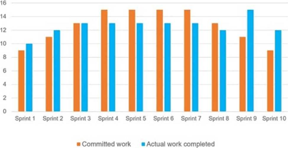 Given the following chart showing committed work (orange) vs. actual work completed (blue) across 10 sprints: