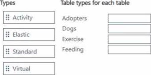 Which table type should you define for each requirement? To answer, move the appropriate table types to the correct tables. You may use each table type once, more than once, or not at all. You may need to move the split bar between panes or scroll to view content. NOTE: Each correct selection is worth one point.