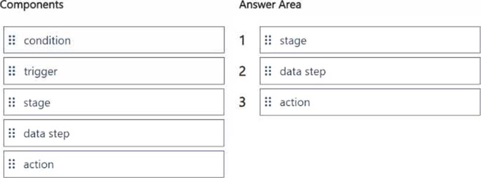 Which three components should you add to the flow in sequence? To answer, move the appropriate components from the list of components to the answer area and arrange them in the correct order.