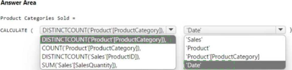 How should you complete the DAX expression? To answer, select the appropriate options in the answer area. NOTE: Each correct selection is worth one point.