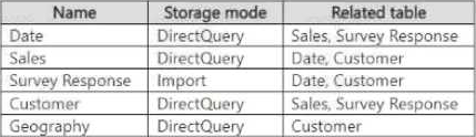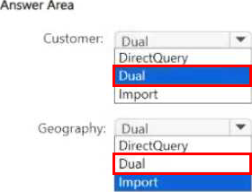 Which storage mode should you select for the Customer and Geography tables? To answer, select the appropriate options in the answer area. NOTE: Each correct selection is worth one point.