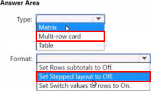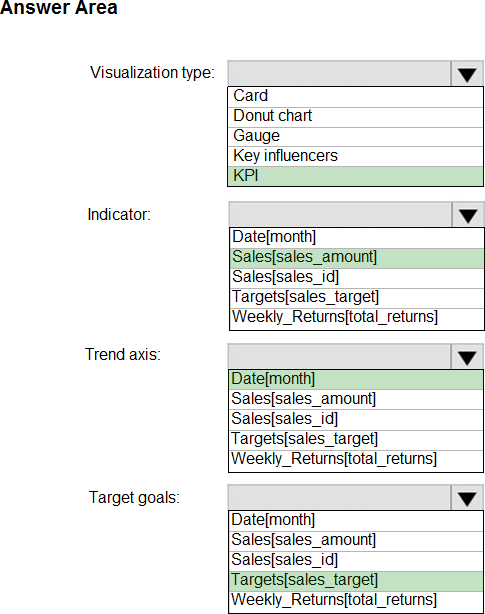 How should you create the visualization? To answer, select the appropriate options in the answer area. NOTE: Each correct selection is worth one point.