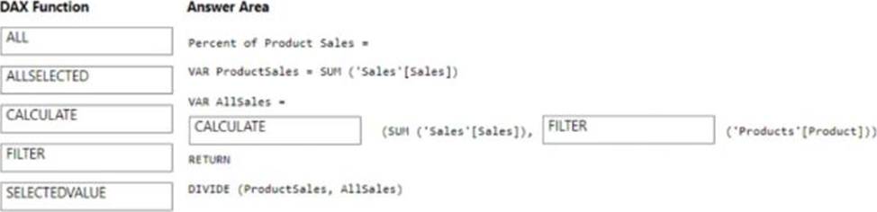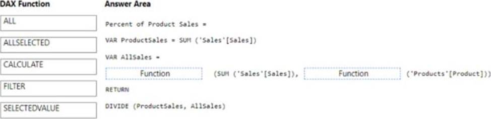 How should you complete the DAX measure? To answer drag the appropriate DAX functions to the correct targets- Each function may be used once, more than once, or not at all the spirt bar between panes or scroll to view content. NOTE: Each correct selection is worth one point